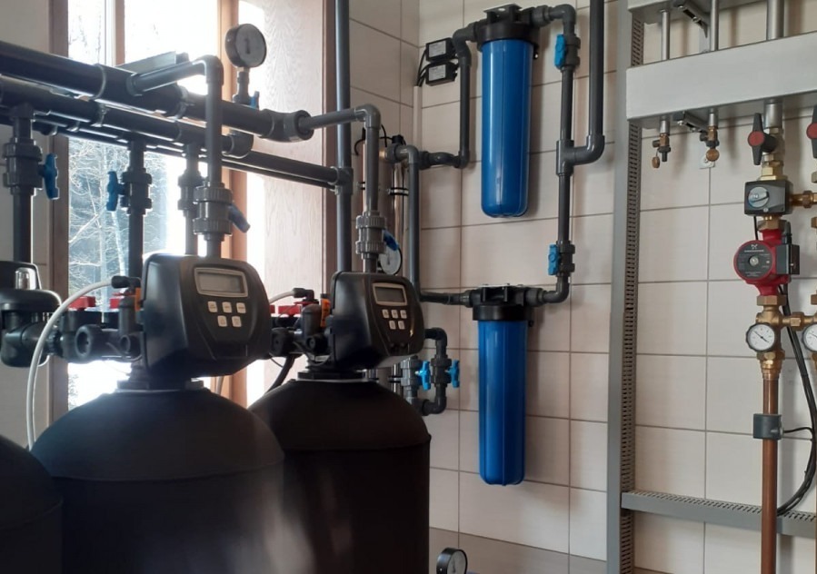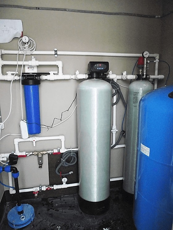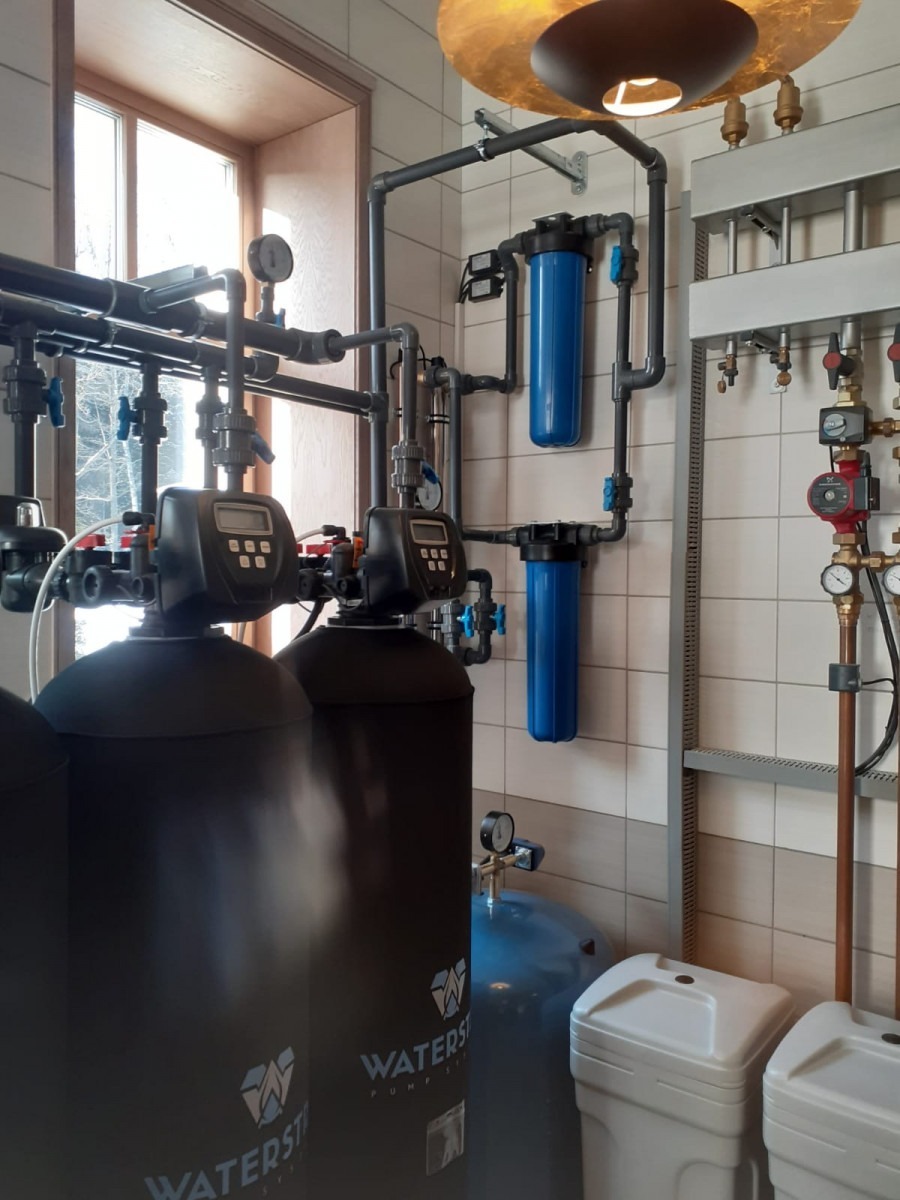 Решение: спроектирована и установлена комплексная система водоочистки, включающая ступень механической фильтрации, колонну обезжелезивания и умягчитель с автоматической промывкой и контролем ресурса, вся обвязка выполнена в едином блоке с удобным доступом для сервиса.